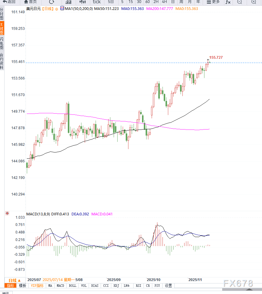 从日线结构来看,美元兑日元维持强势震荡上行格局,日线连续收在155关口上方,加强了多头主导地位。日与20日均线呈持续上行排列,表明趋势仍偏多;