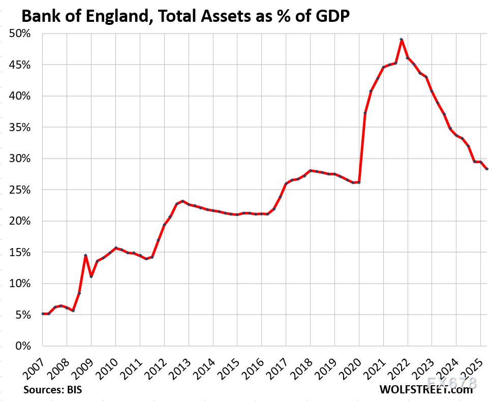 今年5月,英国央行宣布将清空全部债券持仓,并回归传统回购协议(QE前的经典资产负债表管理工具)应对流动性问题。其资产/GDP比例在2021年第四季度触及49%的峰值,据国际清算银行今日数据,目前已降至28.3%:
